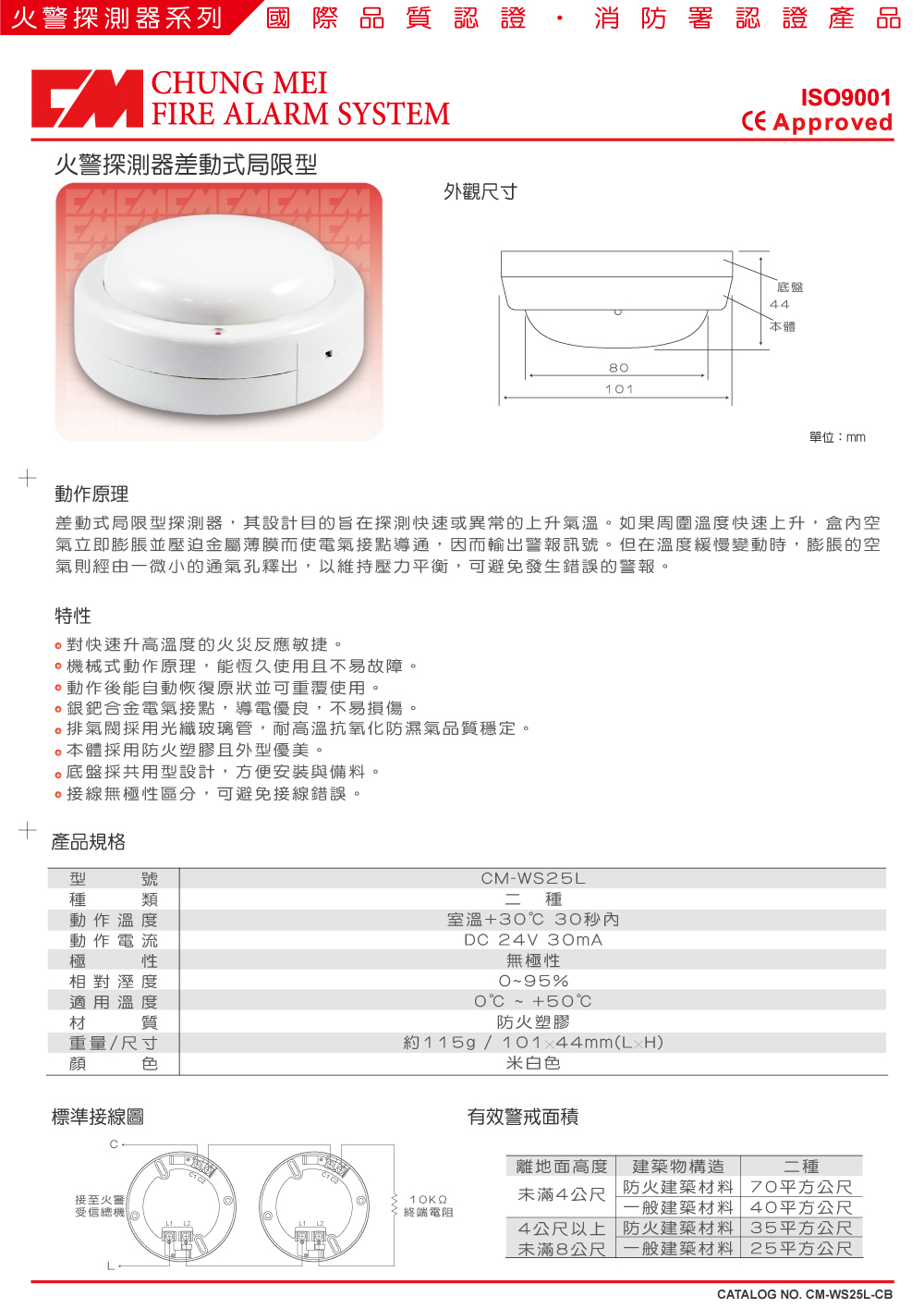 差動式局限型探測器,其設計目的旨在探測快速或異常的上升氣溫。如果周圍溫度快速上升,盒內空氣立即膨脹並壓迫金屬薄膜而使電氣接點導通,因而輸出警報訊號。但在溫度緩慢變動時,膨脹的空氣則經由一微小的通氣孔釋出,以維持壓力平衡,所以絕不會發生錯誤的警報。