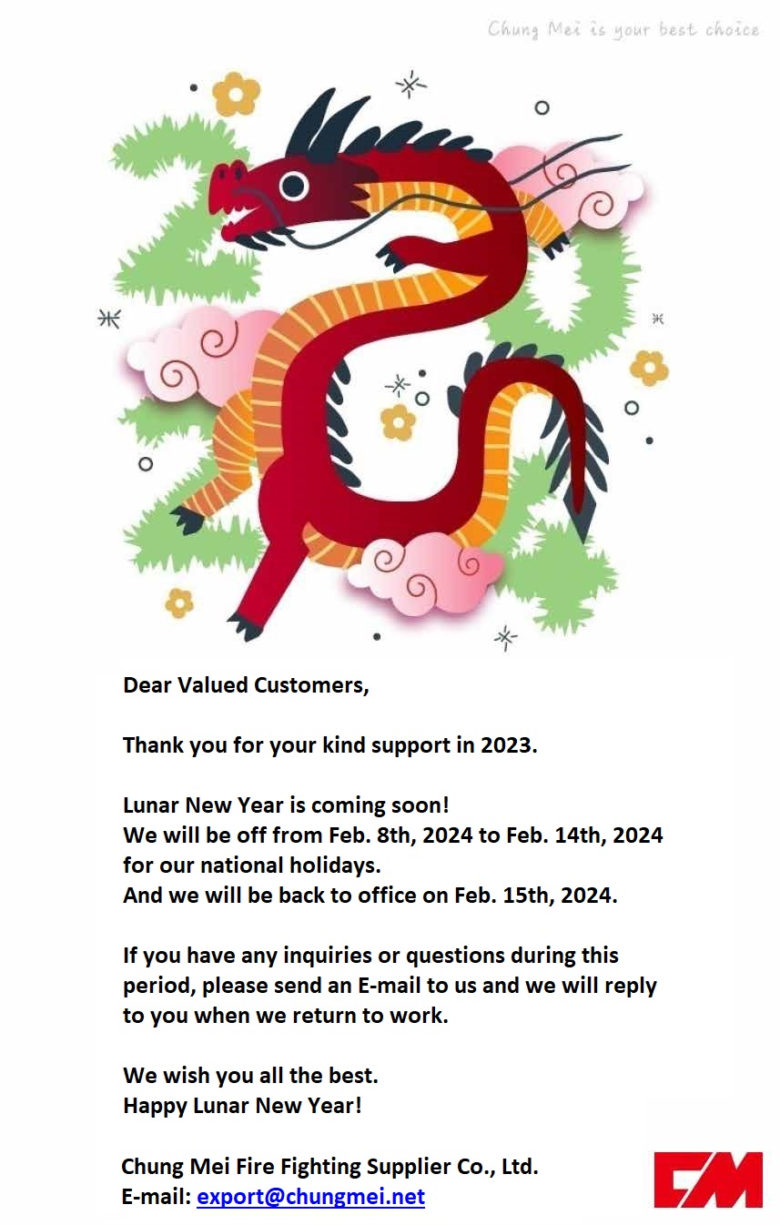 ![]() Dear Valued Customers, Thank you for your kind support in 2023. Lunar New Year is coming soon! We will be off from Feb. 8th, 2024 to Feb. 14th, 2024 for our national holidays. And we will be back to office on Feb. 15th, 2024. If you have any inquiries or questions during this period, please send an E-mail to us and we will reply to you when we return to work. We wish you all the best. Happy Lunar New Year! Chung Mei Fire Fighting Supplier Co., Ltd. E-mail: export@chungmei.net |
